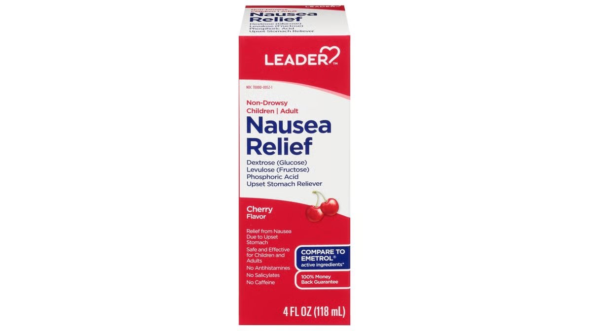 Leader Nausea Relief 4 oz con sabor cherry es una opción práctica para aliviar náuseas y malestar estomacal ocasional. Ideal para tener en casa o llevar de viaje en Puerto Rico, útil tanto para niños como para adultos.