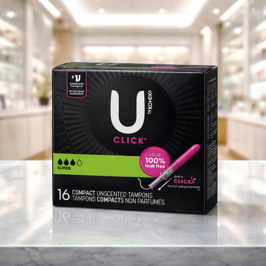 U by Kotex Click Super (16) es una opción práctica para días de mayor flujo, con aplicador plástico y sistema Click para uso cómodo. Ideal para seguridad extra en Puerto Rico.